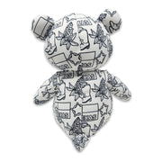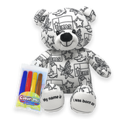 What a cool teddy! You can color on it with the provided markers or use any other washable markers you may already own. It is machine washable, so you can wash it and start the fun all over! This teddy has "Texas" printed on it along with related icons. Icons include the state flag, a sheriff's badge, a pair of cowboy/cowgirl boots, and blue bonnet. Top these things off by giving your bear a name and birthday.