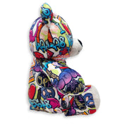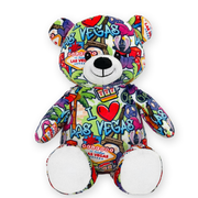 This super soft teddy bear is made entirely with recycled plastic bottles! This is a proprietary graffiti inspired design is printed on a sustainably soft velboa material. When made into a teddy, it creates a unique item unlike any of the others made from the same material. This teddy has "I (heart) Las Vegas" printed on it along with symbols like the a peace sign, a magic hat with with dice, a palm tree, the Eiffel Tower, a flamingo, and even the iconic Welcome to Las Vegas sign.