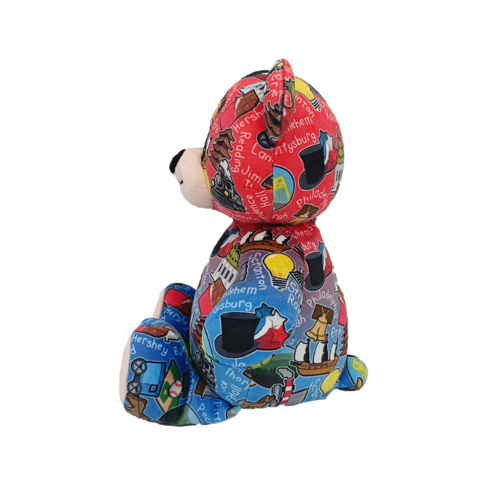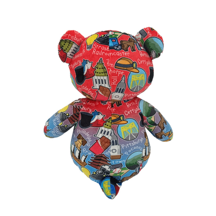 This super soft teddy bear is printed with city names and related icons. This is a proprietary design printed on soft velboa material. When sewn into a teddy, it creates a unique item unlike any of the others made from the same material. This teddy features locations such as Philadelphia, Poconos, Pittsburgh, and Gettysburg!